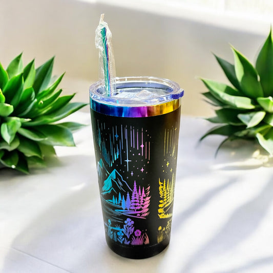 Aurora Forest Rainbow-Plated Engraved Tumbler with Lid & Straw – 20oz Stainless Steel Insulated Travel Mug