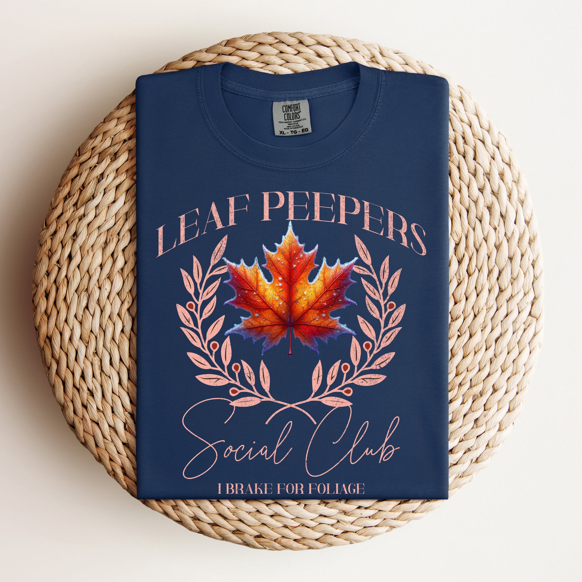 This Leaf Peeper Shirt Design showcases a vibrant maple leaf and laurel wreath graphic, perfect for fall clothing enthusiasts seeking casual wear that combines nature-inspired style with comfort. This top features a "Leaf Peepers Social Club" text design and "I brake for foliage" tagline, making it an ideal addition to any autumn fashion lover's wardrobe.