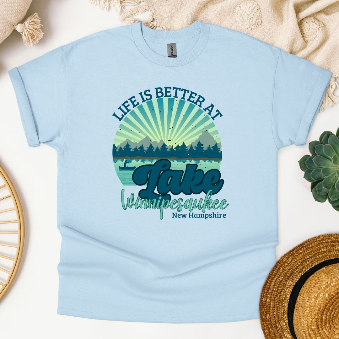 Escape the hustle and bustle and enjoy the best of lakeside living at Lake Winnipesaukee. With our Life is better at Lake Winnipesaukee t-shirt, show your love of lake life in New Hampshire. Explore the sparkling waters, the charming towns of New Hampshire and walk the Pier at Weirs Beach. Embrace the quirky charm and laid-back lifestyle of this iconic destination with our souvenir t-shirts. Get yours today!