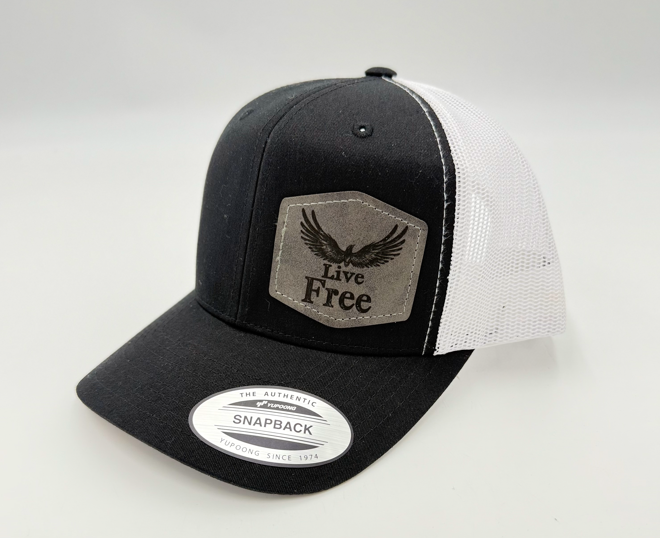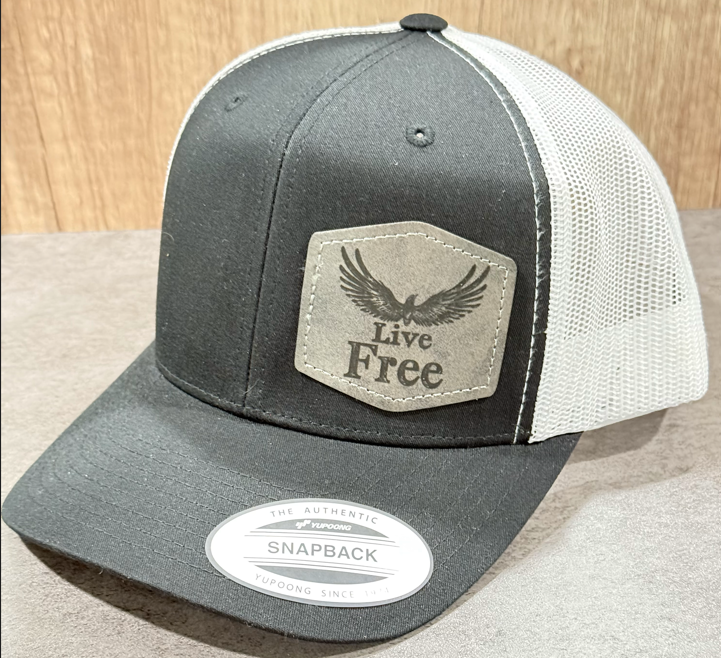 Embrace the spirit of freedom with this bold and stylish trucker hat, featuring a laser-engraved leatherette patch with the words "Live Free" and a majestic eagle. Inspired by New Hampshire’s Live Free or Die motto, this hat is perfect for patriots, adventurers, and anyone who values independence and the great outdoors.